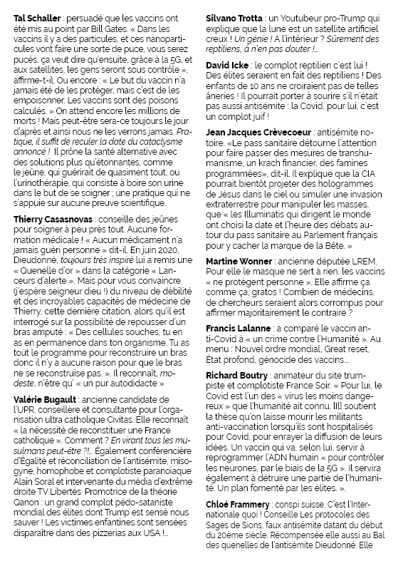 Richard Boutry : animateur du site trumpiste et complotiste France Soir. « Pour lui, le Covid est l’un des « virus les moins dangereux » que l’humanité ait connu. [Il] soutient la thèse qu’on laisse mourir les militants anti-vaccination lorsqu’ils sont hospitalisés pour Covid, pour enrayer la diffusion de leurs idées. Un vaccin qui va, selon lui, servir à reprogrammer l’ADN humain « pour contrôler les neurones, par le biais de la 5G ». Il servira également à détruire une partie de l’humanité. Un plan fomenté par les élites. ».