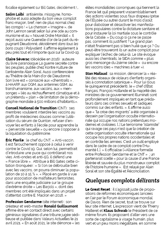 Éric Fiorile : le chef du CNT. “Anti-vaccin, il est farouchement opposé à celui à venir contre le Covid-19. Qui, selon lui, permettrait d’introduire une puce qui contrôlerait nos vies. Anti-ondes et anti-5G, il défend une « France libre ».” Attribue à Bill Gates (encore lui!) cette citation (tronquée) : « Si l’on se débrouille bien avec les vaccins, on pourra diminuer la population de 10 à 15 % ». Or, « ce n’est pas la population que Bill Gates espère réduire de 10 à 15 %, mais son accroissement ». « Placé en garde à vue pour association de malfaiteurs terroristes, dans une enquête judiciaire sur le groupe d’extrême droite « Les Barjols », dont des membres ont été impliqués dans un projet d’attentat contre E. Macron en 2018. » Finalement jugé pour « détention d’arme de catégorie B ».